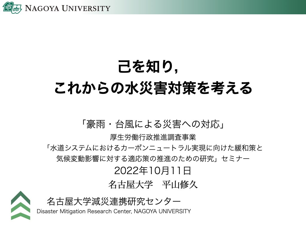 平山准教授は,2022年10月11日,保健医療科学院「水道工学研修」(「豪雨・台風による災害への対応」厚生労働行政推進調査事業「水道システムにおけるカーボンニュートラル実現に向けた緩和策と気候変動影響に対する適応策の推進のための研究」セミナー)において,「己を知り,これからの水災害対策を考える」と題した講義・ワークショップを行いました。