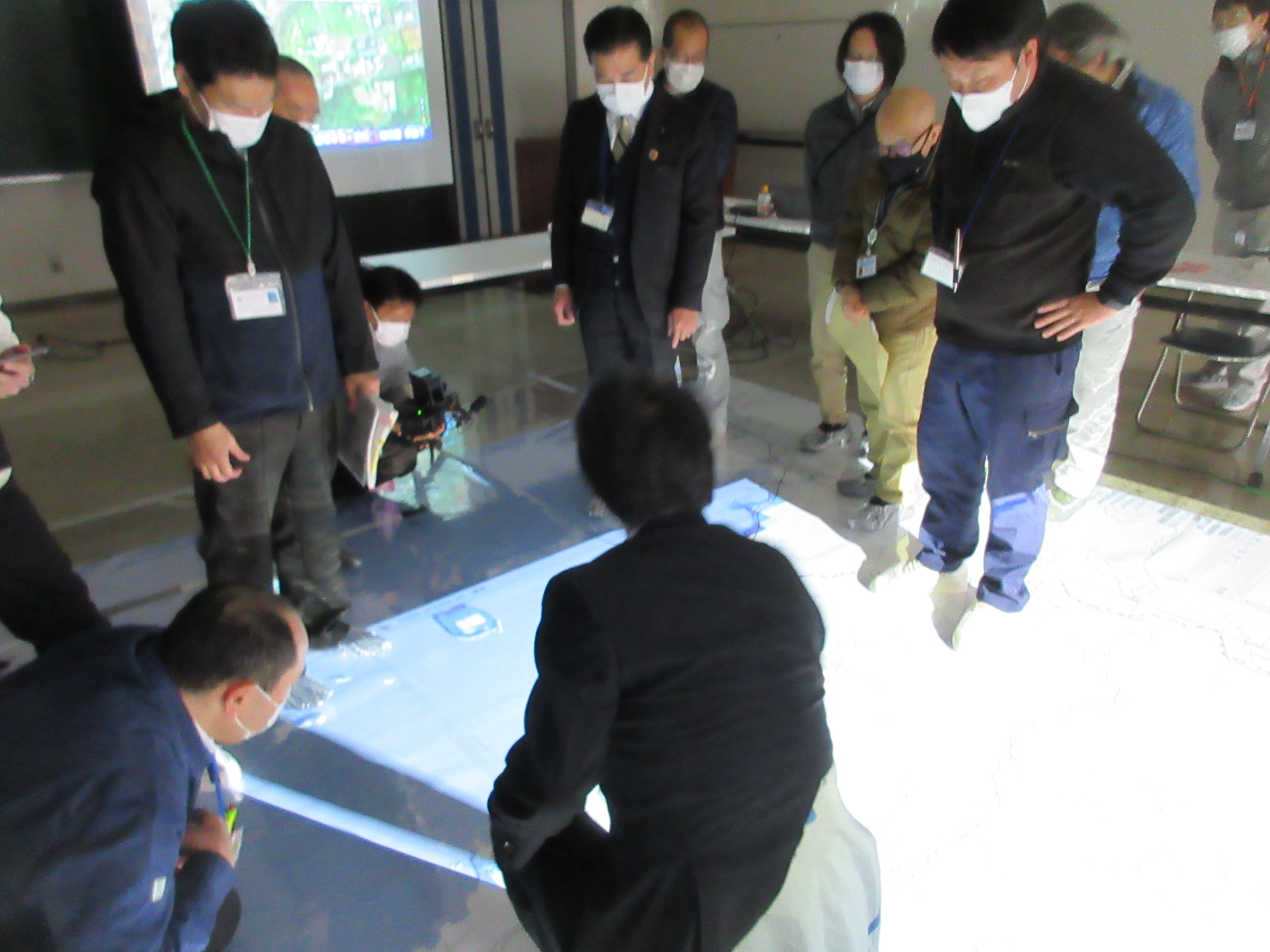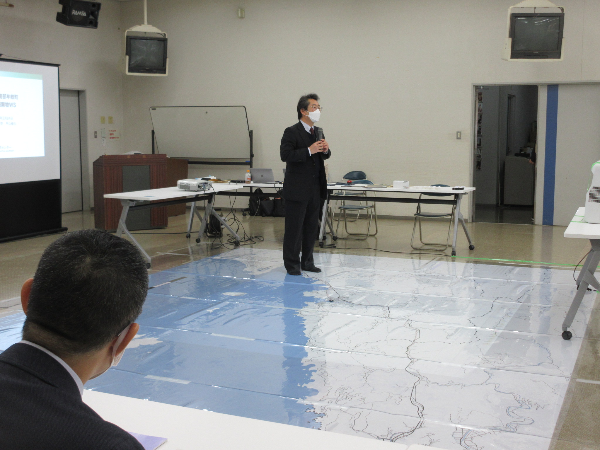 Assoc. Prof. Hirayama et al. conducted a workshop on disaster debris temporary sites using a giant map projection mapping at a workshop on disaster debris in Mugi Town, southern Tokushima Prefecture on February 24, 2023.